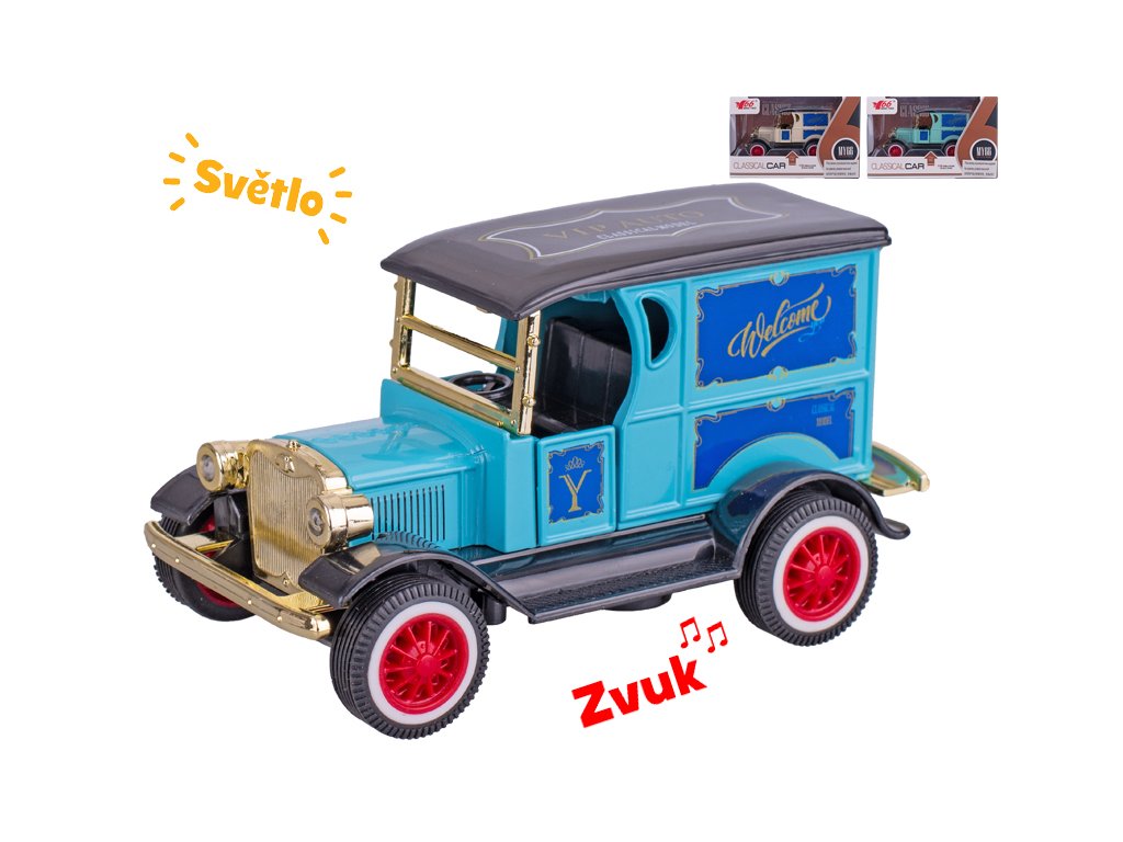 Auto Old Timer, 11 cm, kovový model na baterie se zpětným chodem, světlem a zvukem. Baterie 3× LR41 jsou součástí balení. K dispozici ve třech barvách: oranžová, zelená a červená.
