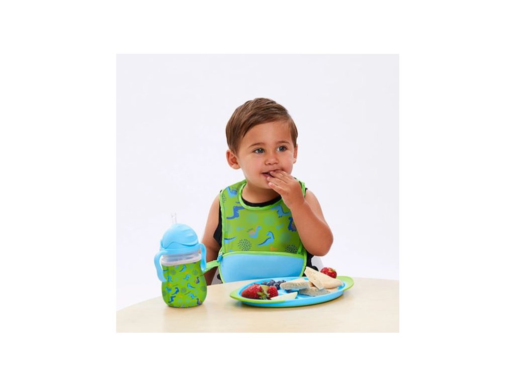Nastavitelný obvod kolem krku zaručuje pohodlí pro každé dítě. Díky poutku lze bryndák snadno zavěsit na kočárek nebo tašku. Po použití ho jednoduše vyperte v pračce a je znovu připraven k použití.