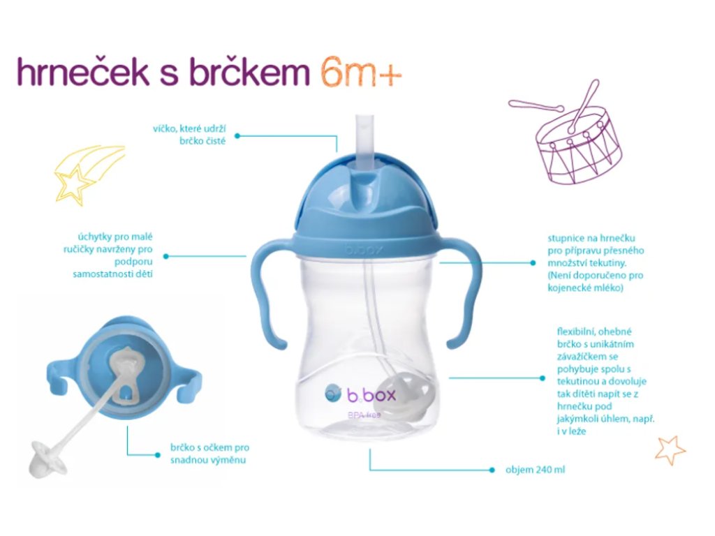 K tomuto produktu doporučujeme zakoupit náhradní brčka a kartáček. Hrneček s brčkem oceňovaný dětmi, rodiči i odbornou veřejností je zde v ještě lepším provovedení! Víčko je nyní v matné verzi a brčko má na spodním konci malou zátěž ve tvaru loga b.box. Díky této zátěži se brčko pohybuje spolu s nápojem a lze tak pít z hrnečku pod jakýmkoli úhlem. Jednoduché úchyty na hrnečku a snadné odklopení víčka podporují samostatnost vašeho dítěte. Dětský hrneček s brčkem od australské značky b.box je ideální při přechodu na pití z lahve na šálek nebo skleničku.