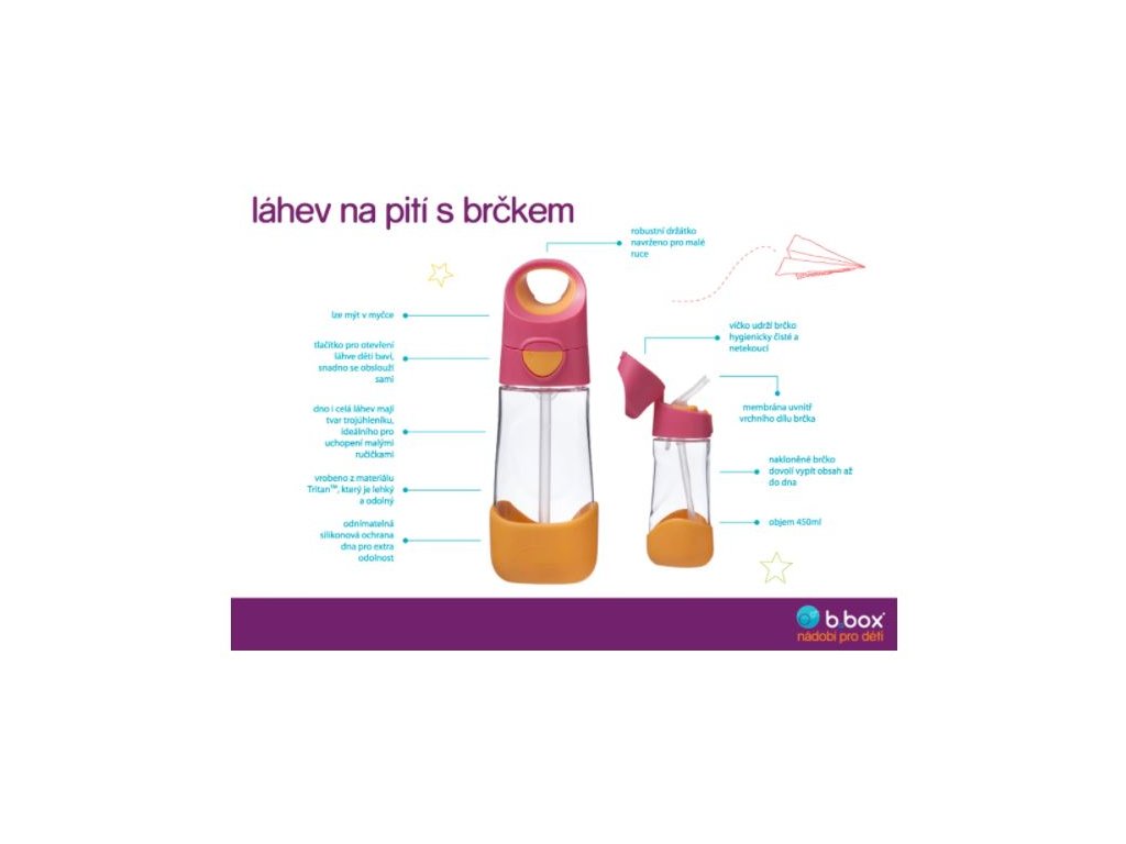 Klíčová slova: B.Box láhev na pití, láhev s brčkem, 450 ml, indigo, růžová, dětská láhev, b.box, australská značka, láhev pro děti, ergonomická láhev, láhev na vodu pro děti.