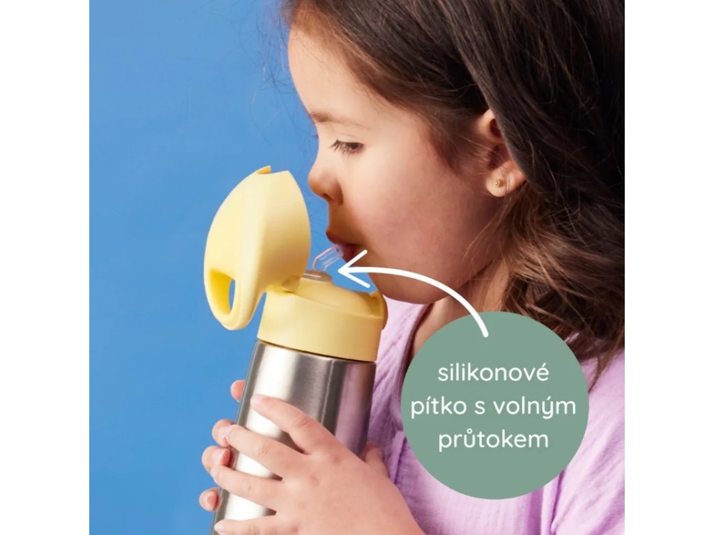 Dvouvrstvá nerezová ocel udrží tekutiny studené až 8 hodin a teplé až 6 hodin. Termoska se po snadném zmáčknutí "tlačítka" lehce otevře. Silikonové brčko je skvělou volbou i menší děti a jednoduše se čistí. Víčko termosky má držátko pro snadné nošení nebo zavěšení na batoh, kočárek apod.