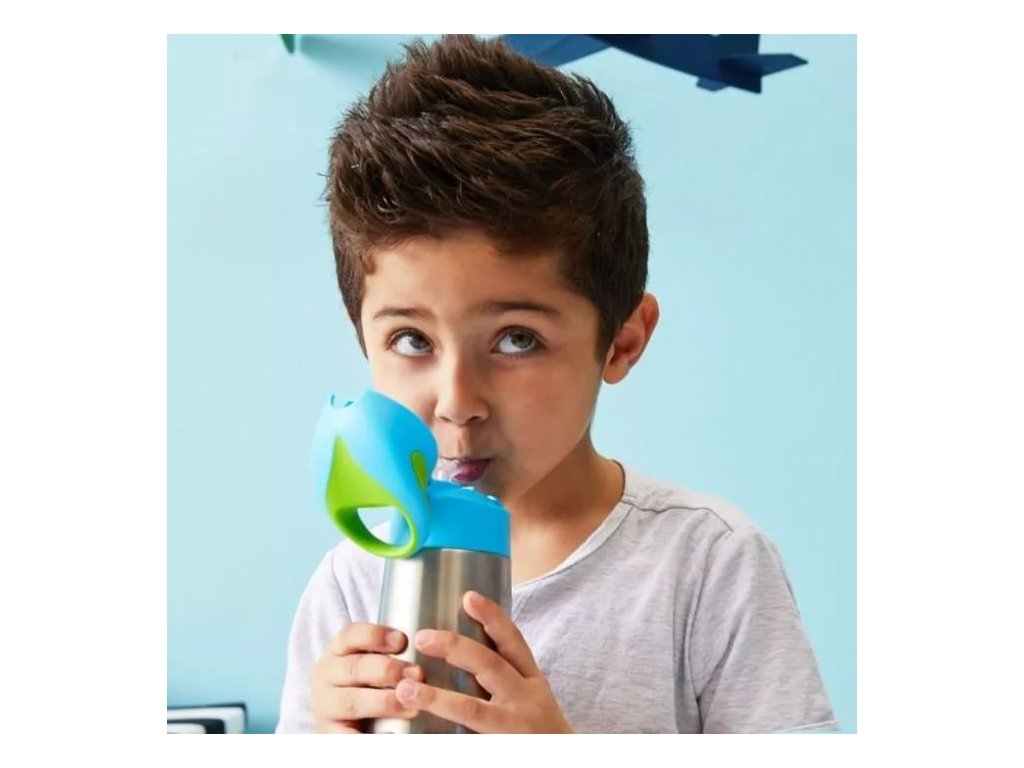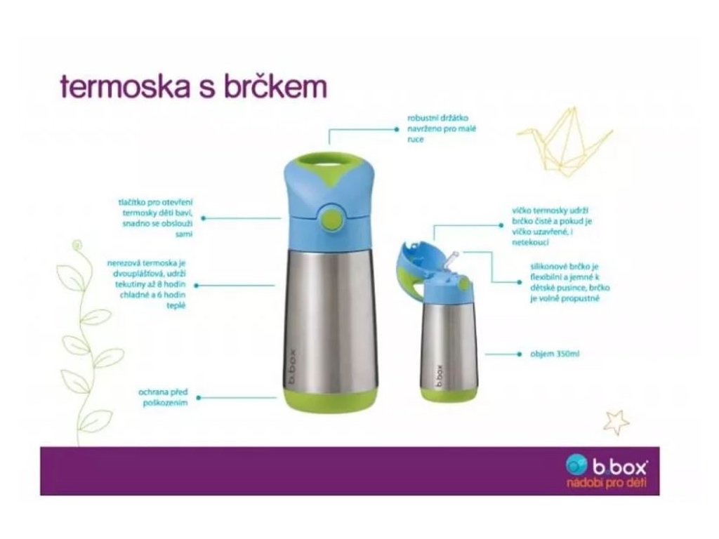 Víčko termosky je vytvořeno tak, aby voda z termosky samovolně nevytékala. Nicméně termoska není výrobcem deklarována jako netekoucí. Brčko v termosce je rovné a kolmé ke dnu termosky. Do termosky nepatří z bezpečnostních důvodů vařící/horké nápoje - vždy zkontrolujte teplotu nápoje před podáním dítěti.