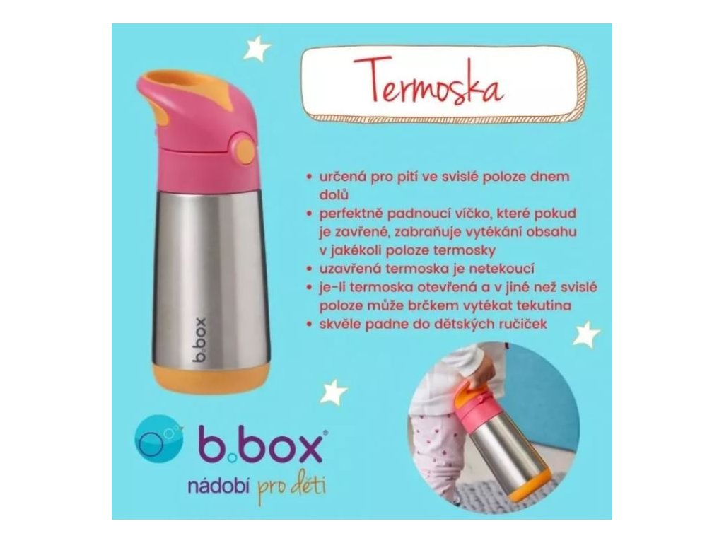 Objevte dokonalého společníka pro každodenní dobrodružství s termoskou B.Box v růžové barvě. Díky dvojplášťové konstrukci z nerezové oceli tato termoska efektivně udrží vaše nápoje teplé až 5 hodin a studené až 7 hodin, takže si můžete vychutnat optimální teplotu nápoje kdykoliv během dne. Silikonové brčko je navrženo tak, aby umožnilo vypít každou poslední kapku bez obtíží. Víčko s praktickým držátkem usnadňuje nošení a zavěšení na batoh, kočárek nebo jiné vybavení. Tento výrobek je ideální pro děti od 12 měsíců, které si zaslouží stylové a funkční řešení pro pití. Investujte do kvality a pohodlí s B.Box termoskou a udržujte nápoje přesně tak, jak mají být.