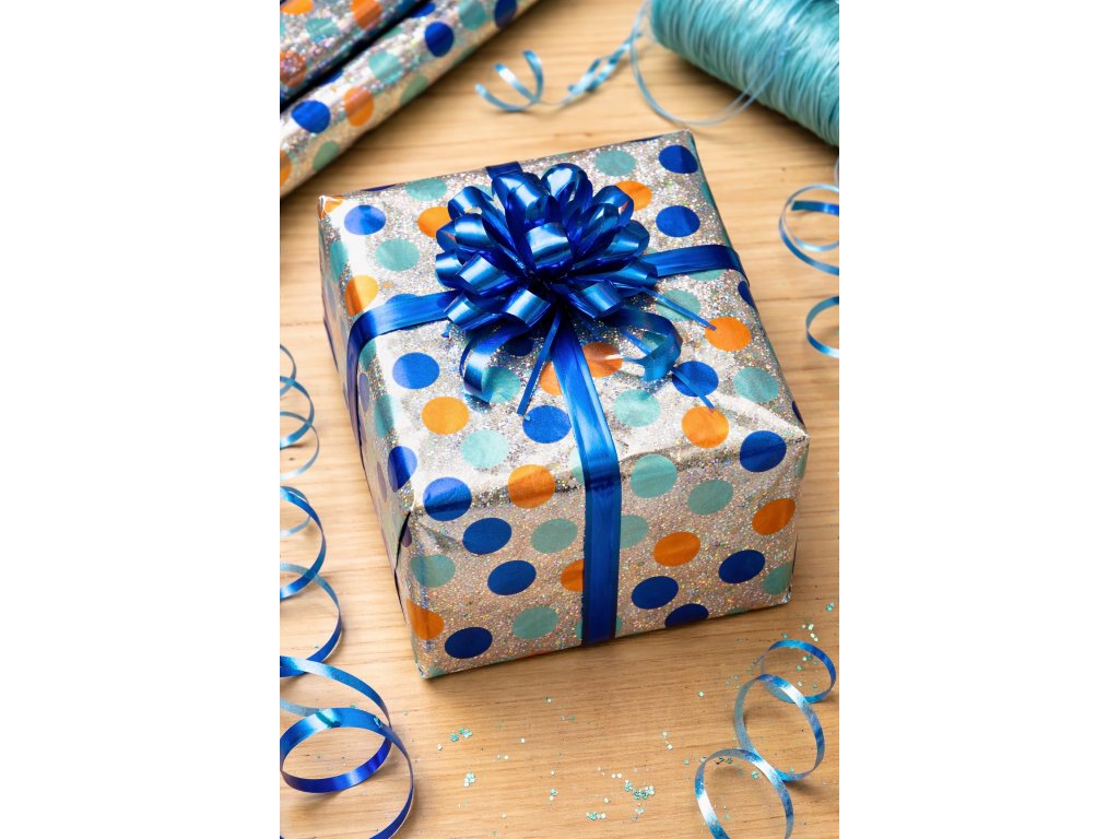 Tento holografický balicí papír s puntíky dodá každému dárku veselý a originální vzhled 🎁✨. Velké barevné puntíky v tmavě modré, oranžové a světle zelené se krásně lesknou a vytvářejí hravý efekt, který zaujme na první pohled.