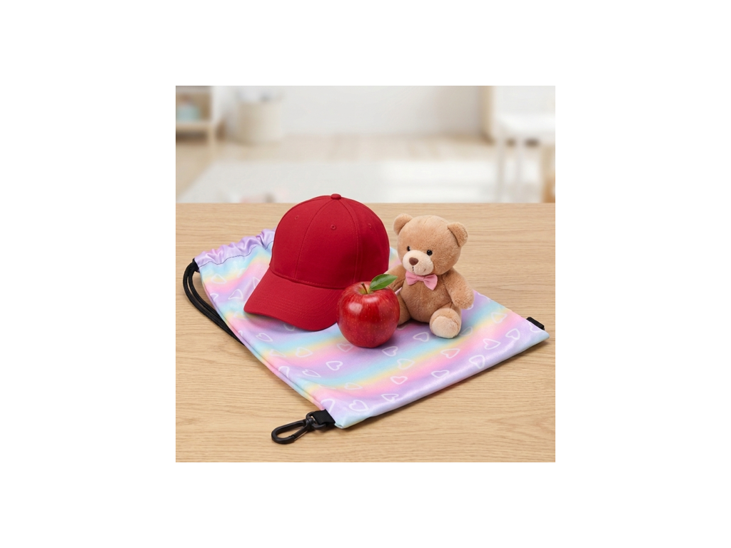 Stylový duhový batoh na šňůrky se srdíčky je skvělou volbou pro každodenní použití dětí. Přední strana je vyrobena z výrazné lesklé duhové látky zdobené bílými srdíčky, která dodává batohu veselý a hravý vzhled.