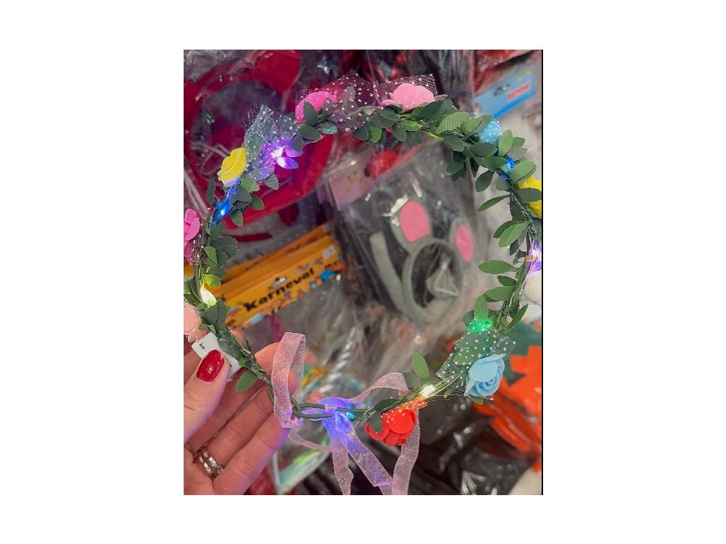 🌹 Dětská svítící čelenka Růže je kouzelný doplněk pro dětské oslavy, karnevaly nebo pohádkové kostýmy. Čelenka tvoří věneček s barevnými růžičkami 💐, doplněný LED světýlky v barvách květin, která lze nastavit buď na trvalé svícení, nebo na blikání ✨.
