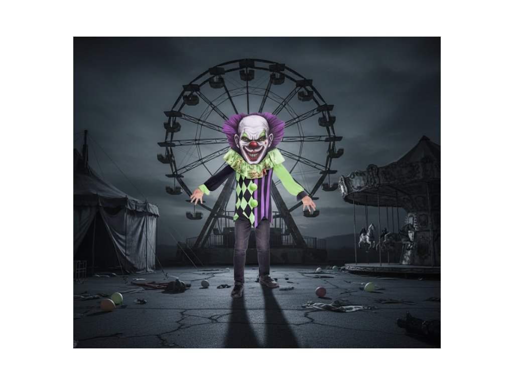 Kostým má výrazný strašidelný design s obří hlavou klauna 🃏 a obsahuje 2D masku na pohodlnou gumičku, která se snadno nasazuje a drží na hlavě. Díky tomu vaše dítě zažije spoustu legrace a překvapí všechny kolem svým vzhledem! 😱✨
