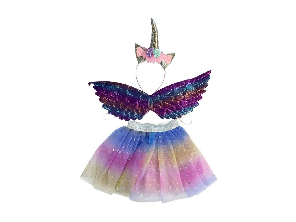 Karnevalový set Víla v různých barvách obsahuje sukni (32 cm), čelenku s ušima, křídla a hůlku – ideální na dětské oslavy a karnevaly.