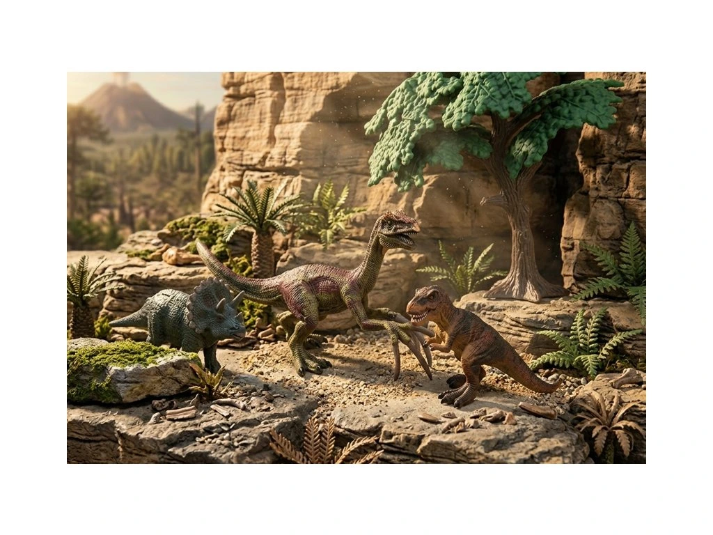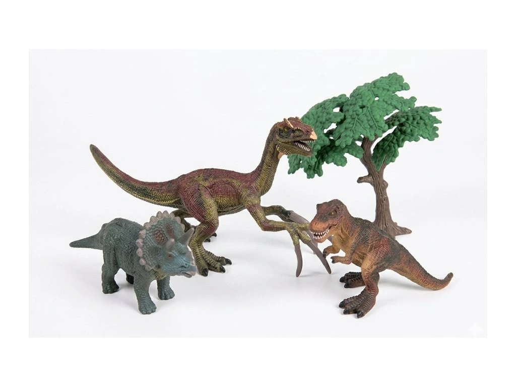 Další dinosauři v setu jsou T-Rex a Triceratops, doplněni o strom a skálu, které zvyšují zábavu při hraní a tvoří realistické prostředí.