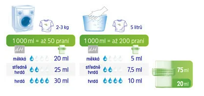 „Díky koncentrovanému složení stačí použít pouze 20 ml tohoto tekutého pracího prostředku místo běžných 75 ml u klasických tekutých pracích prostředků, čímž výrazně ušetříte.“