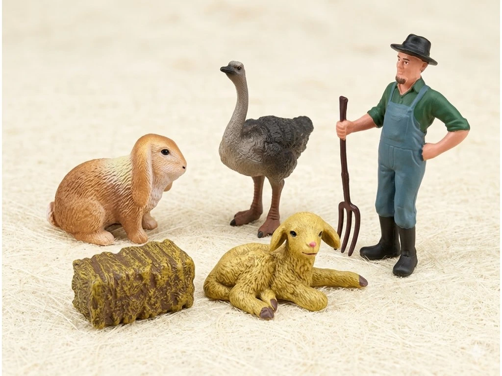 Set obsahuje farmáře v klobouku s vidlemi, husu labutí, jehně, králíka a také žok slámy, díky čemuž si děti mohou vytvořit vlastní farmářské příběhy a dobrodružství.