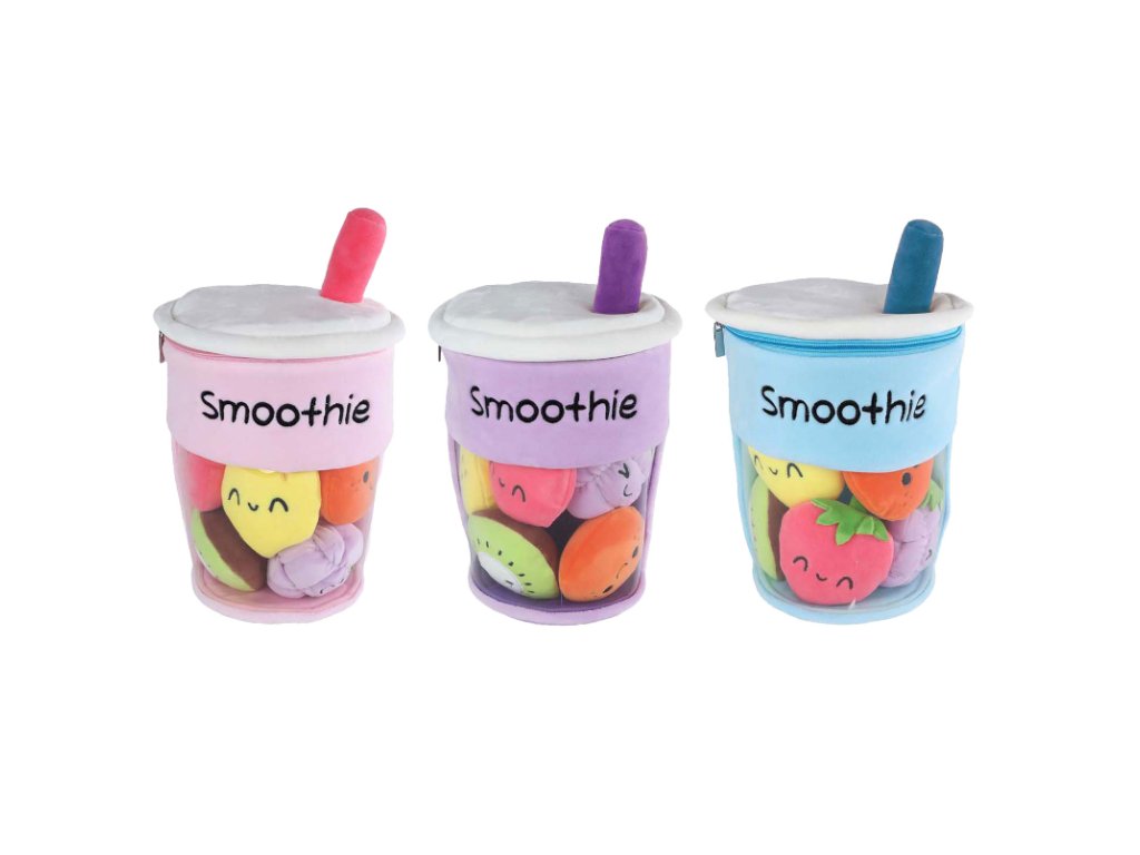 Fluffy Menu Smoothie nápoj je plyšový kelímek na zip a uvnitř najdete: jahodu, pomeranč a hrozno. Máme ho ve 3 barvách: modrá, růžová, fialová. Vhodný od 0+.