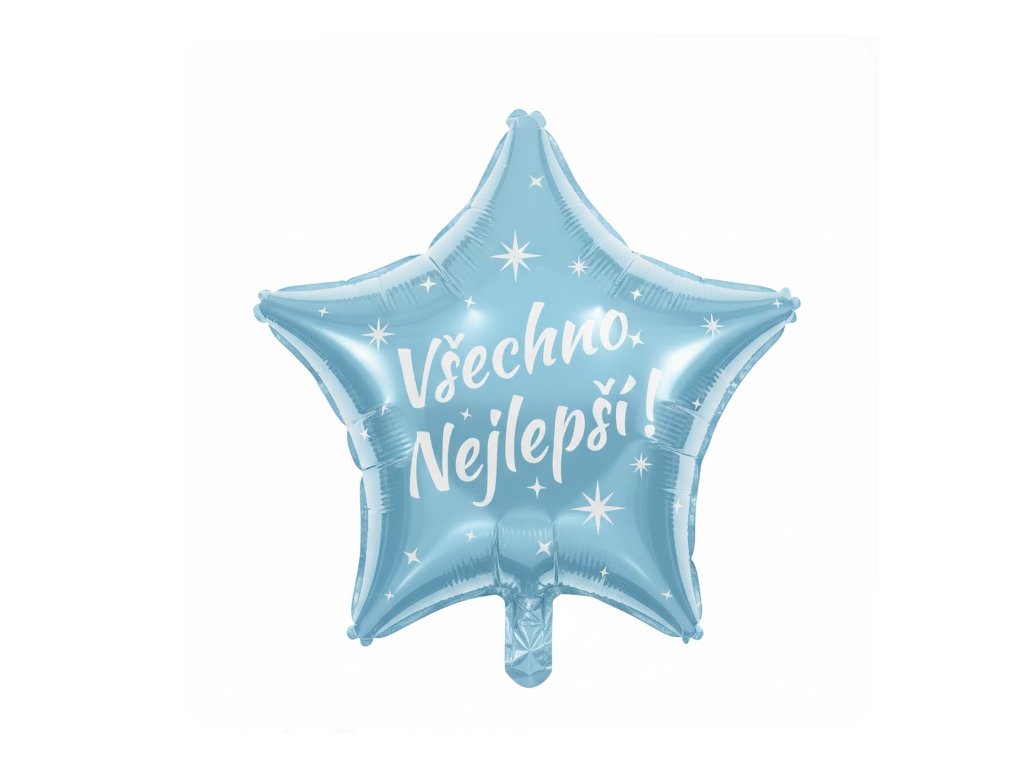 Fóliový balónek hvězda 45 cm „Všechno nejlepší!“ ve světle modré barvě s bílým textem dodá každé oslavě svěží a slavnostní atmosféru. ⭐💙 Díky jemnému barevnému provedení se hodí pro děti i dospělé a snadno se kombinuje s dalšími dekoracemi. ✨