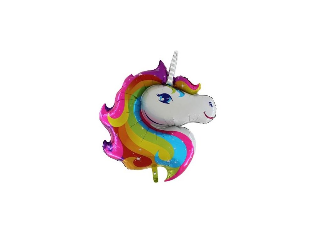 Velký fóliový balónek ve tvaru hlavy jednorožce 83 × 73 cm v pestrých barvách. Výrazná dekorace vhodná na narozeninové oslavy, dětské párty i tematické akce.