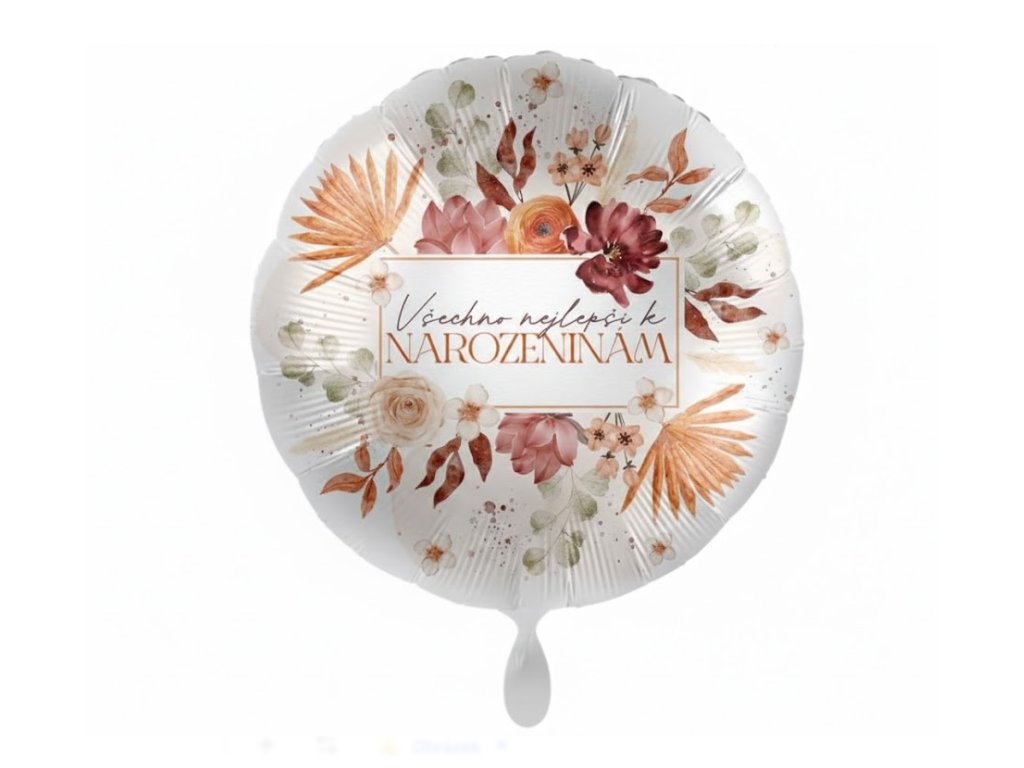 Oslavte narozeniny stylově s kulatým fóliovým balónkem Všechno nejlepší k narozeninám 🎉🎈 Balónek je v bílé barvě a zdobený jemnými květinami a listy, což mu dodává slavnostní a elegantní vzhled 🌸🍃