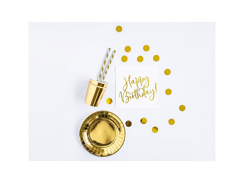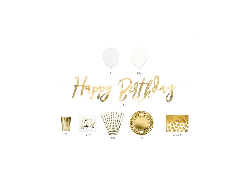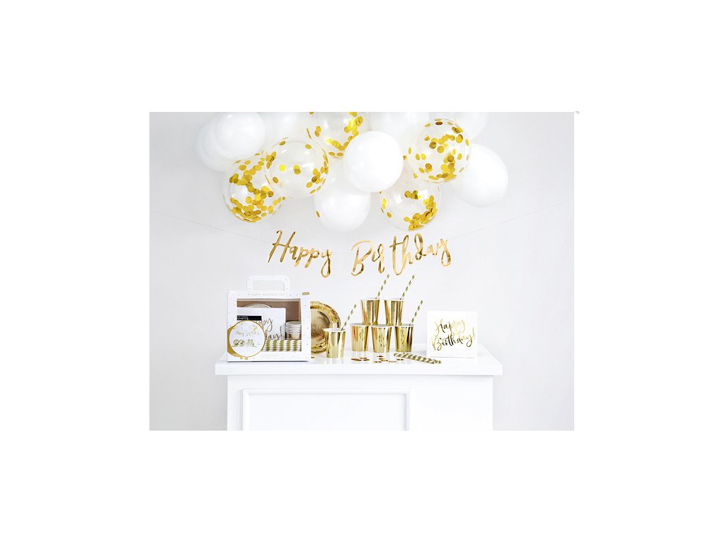 party set Happy Birthday, narozeninová výzdoba zlatá, kompletní party sada, dekorace na oslavu, narozeninové doplňky, zlatý party set, talířky kelímky brčka ubrousky, konfety a balónky, elegantní narozeninová výzdoba, oslavy narozenin dekorace