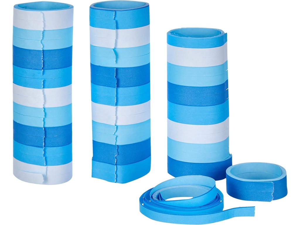 papírové serpentýny, modré serpentýny, dekorace na oslavu, párty výzdoba, bílé a modré serpentýny, narozeninová dekorace, papírové dekorace, barevné serpentýny, levné párty doplňky