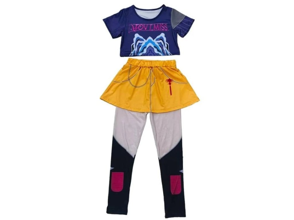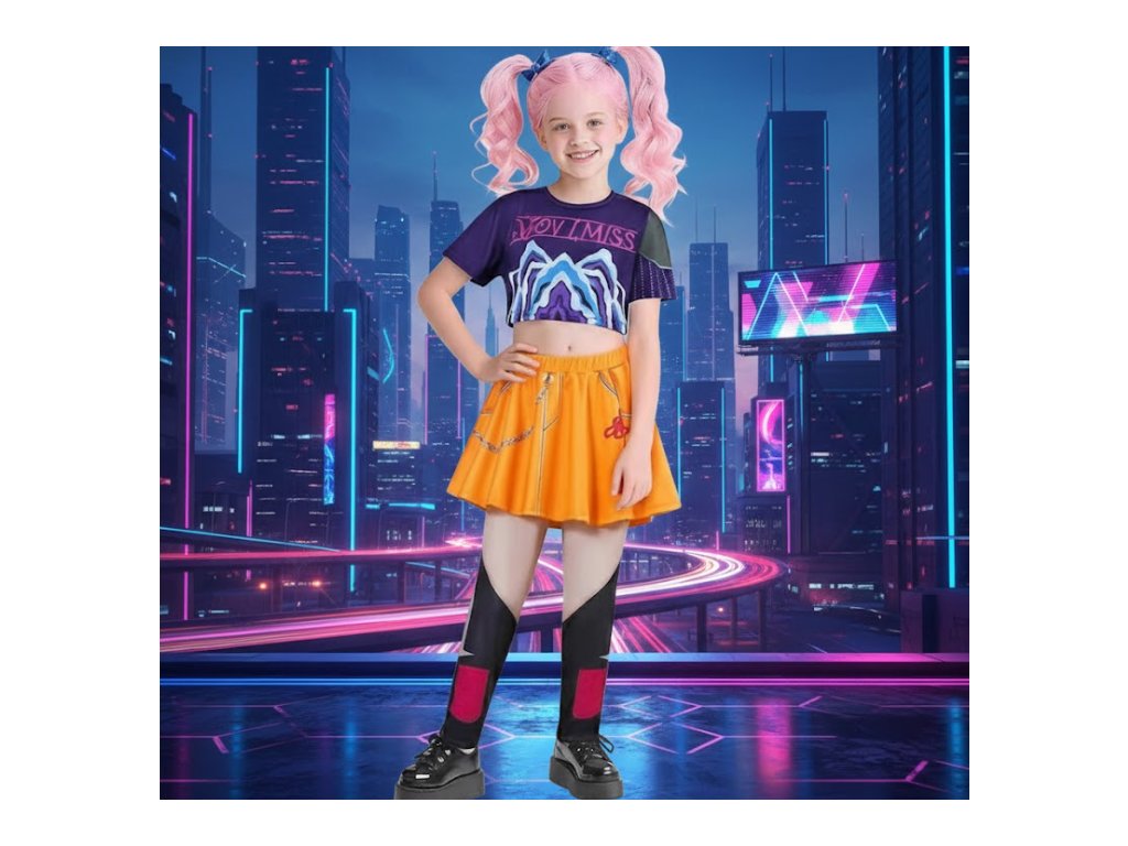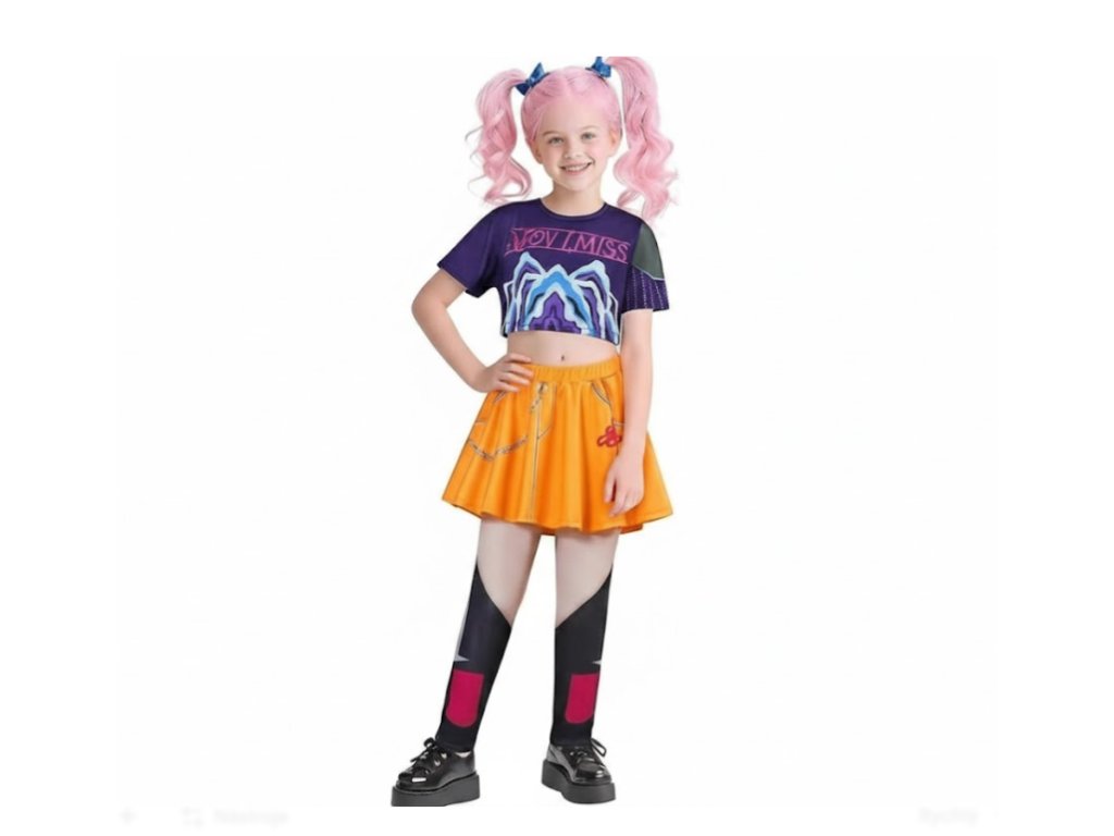Proměňte se v odvážnou hvězdu s kostýmem KPop Demon Hunters Mira od značky Amscan. Tento výrazný outfit se skládá z trička a sukně s legínami, které společně vytvářejí pohodlný a efektní celek vhodný na karneval, vystoupení i každodenní hraní.