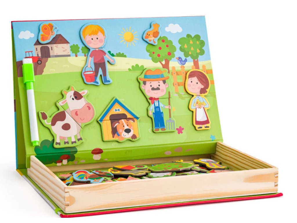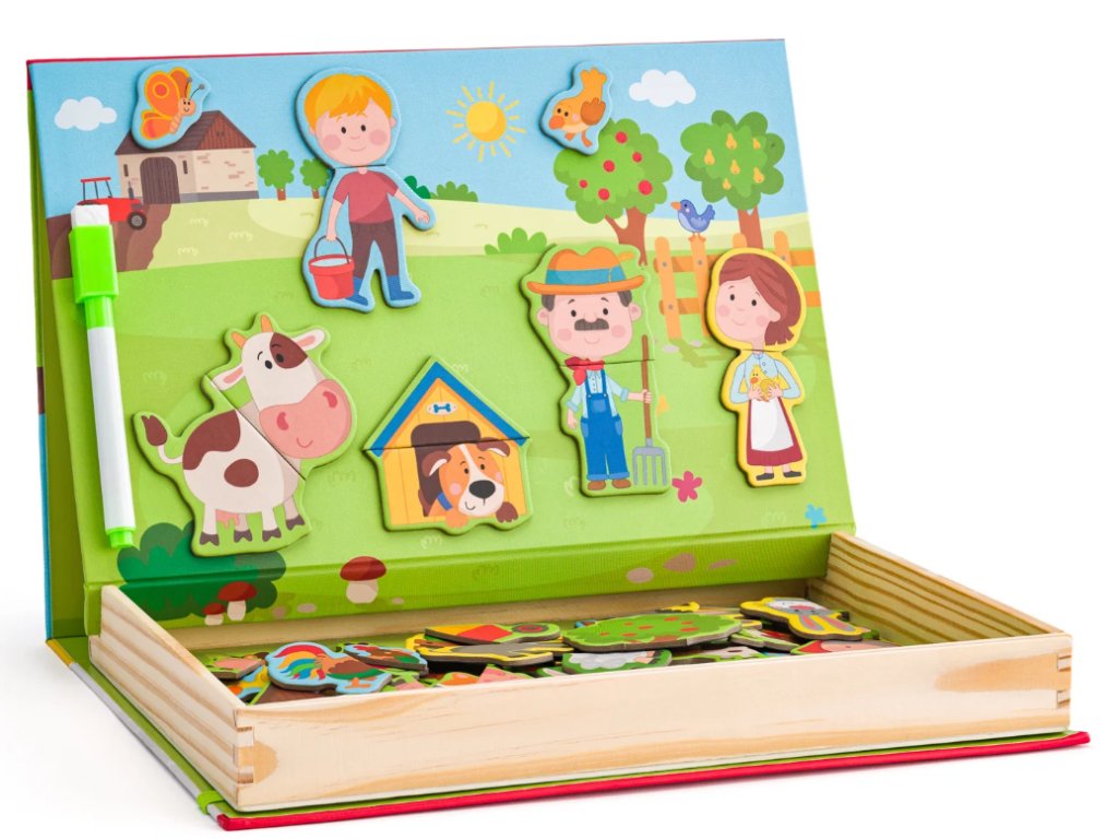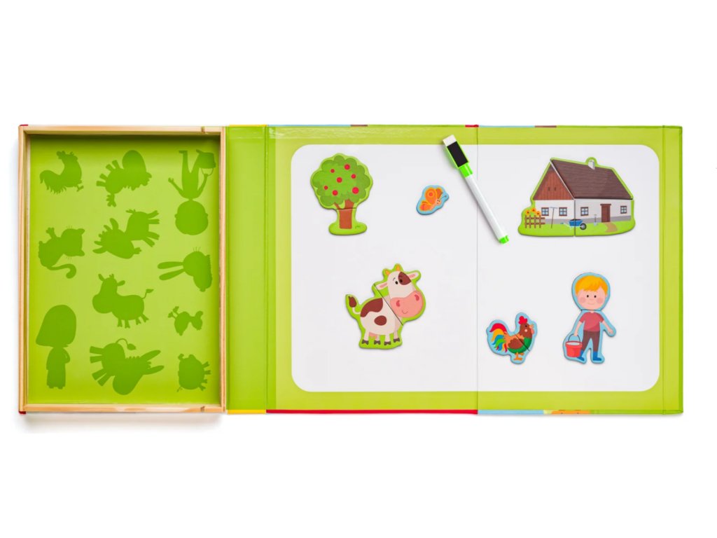 Vítejte na farmě plné zvířátek! 🐮🐔🐑 Děti si s touto magnetickou krabičkou mohou poskládat svůj vlastní statek, zapojit fantazii a vytvářet příběhy z farmářského života. Díky magnetickým dílkům drží vše pěkně na místě – ideální hra doma i na cestách. 🌾