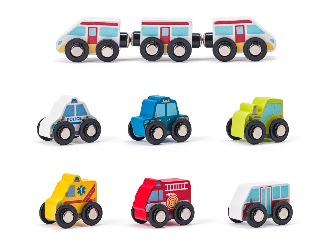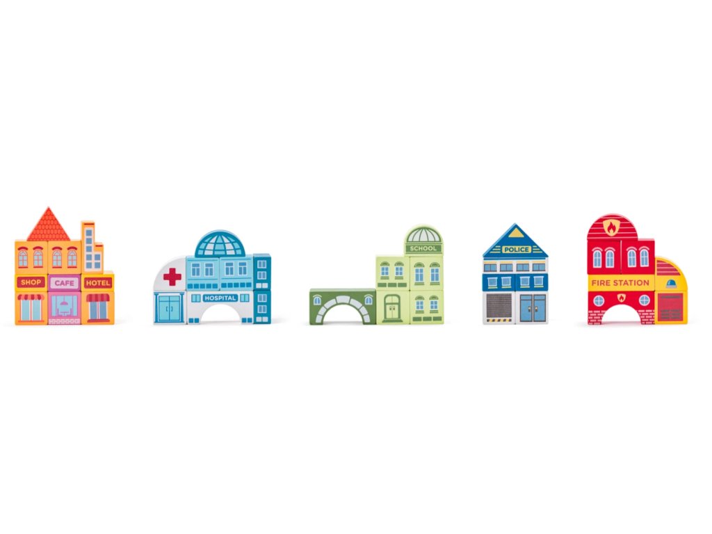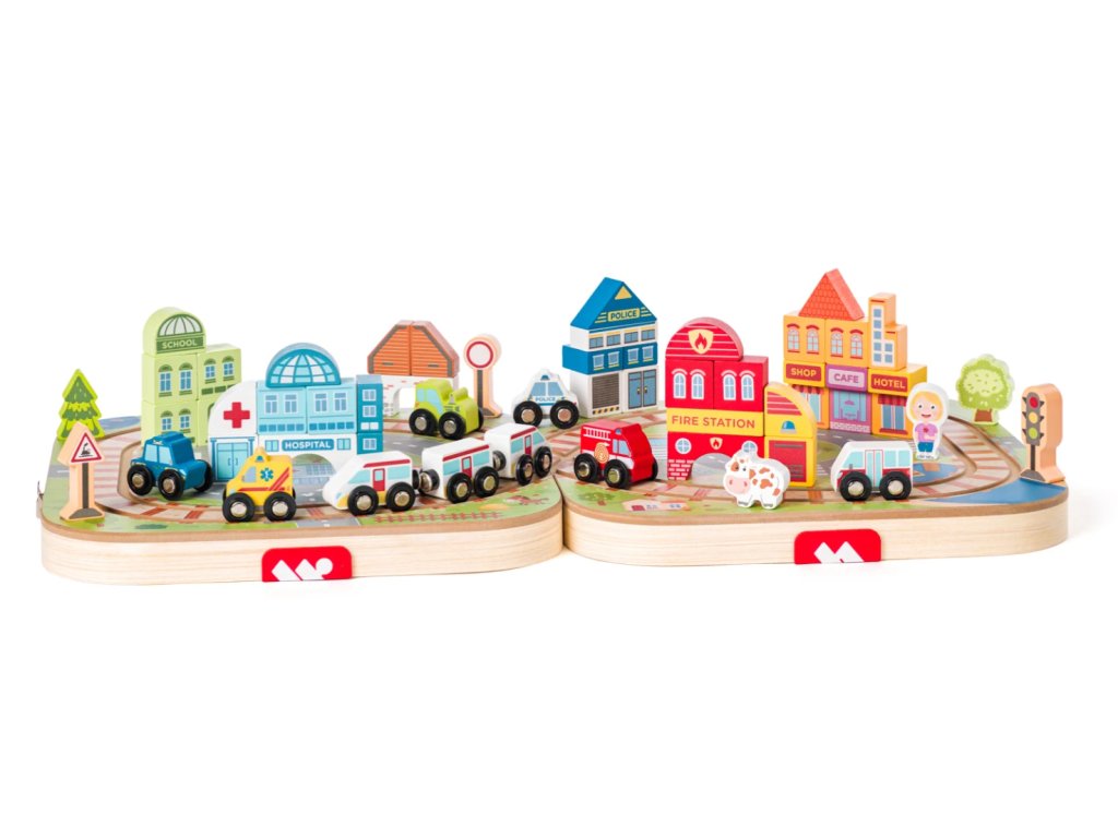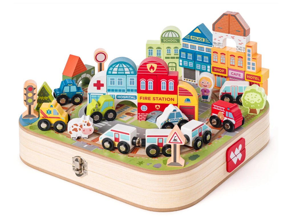 Součástí je 55 dílů, mezi které patří dřevěný vláček, autíčka a kostky pro stavbu domečků, takže si děti mohou vytvořit vlastní město a rozvíjet svou představivost, kreativitu i jemnou motoriku 🧩🌟. Jedinečný design pochází od české výtvarnice, což dodává celé sadě originální a krásný vzhled.