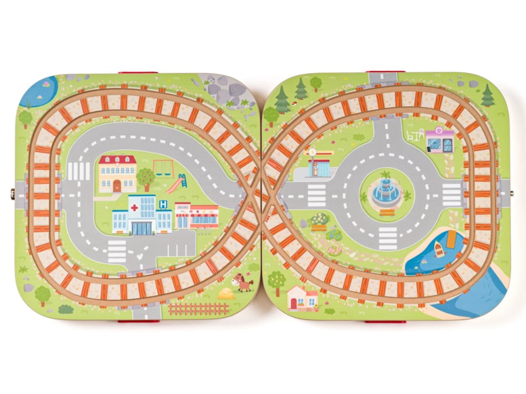 Otevřete kouzelný svět železnic s tímto nádherným dřevěným kufříkem s městem a vláčkodráhou 🚂🌆! Po rozložení kufříku vznikne na obou jeho stranách malebná krajina s dráhou ve tvaru osmičky, která má přesně vyfrézované koleje pro snadnou a plynulou jízdu vláčku 🛤️✨.