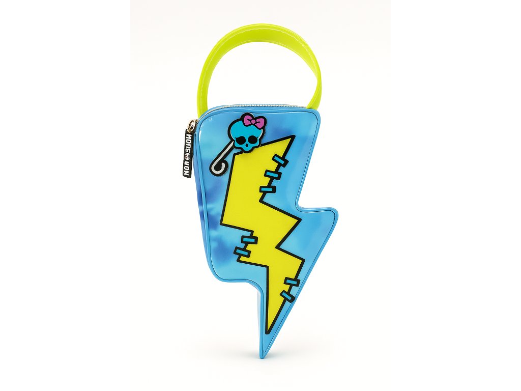 Kabelka Frankie má jasně žlutý blesk na modrém pozadí s neonovým uchem - přesně v duchu její elektrizující energie.