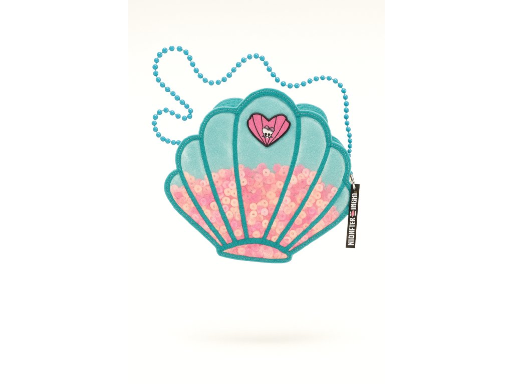 Elegantní kabelka ve tvaru třpytivé mořské mušle v tyrkysových odstínech s růžovými detaily, zavěšená na modrém korálkovém řetízku.