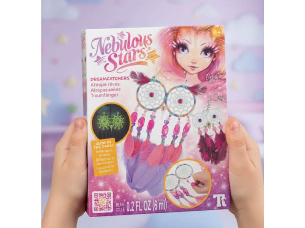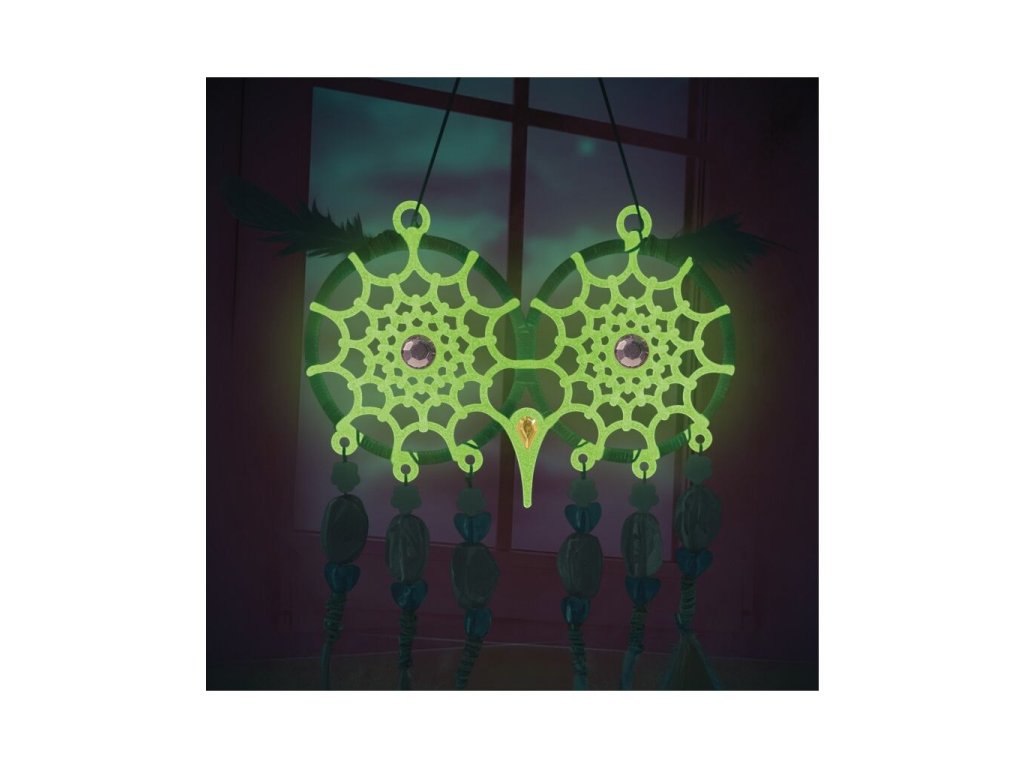 Kreativní sada Nebulous Stars – Lapač snů (svítí ve tmě) umožňuje vyrobit si 2 jedinečné lapače – závěsnou dekoraci a klíčenku, které po nasvícení fosforeskují a stanou se kouzelnou ozdobou pokoje 💫.