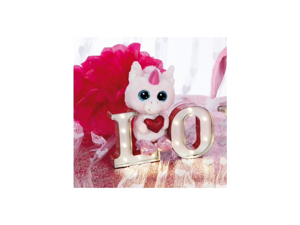 Jednorožec drží metalické srdíčko, které mu dodává kouzelný vzhled, a jeho růžová kopýtka podtrhují něžný a veselý design. Díky své velikosti je ideální na mazlení, dekoraci i jako dárek z lásky.