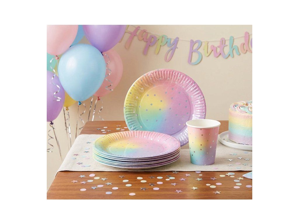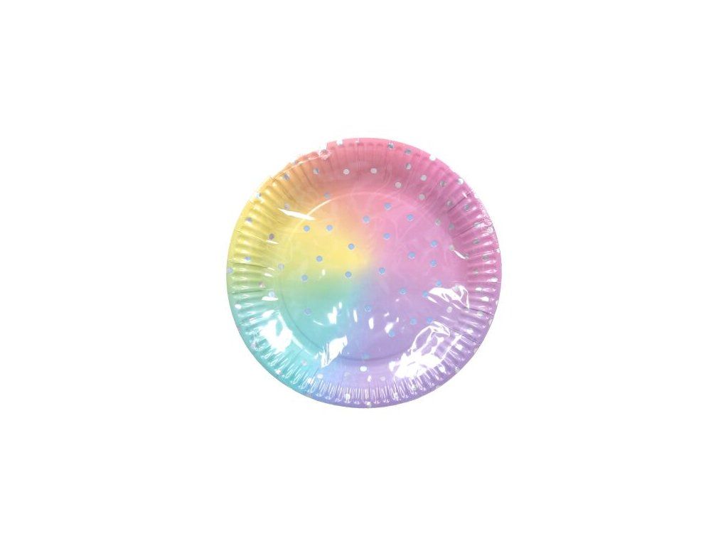 Párty talířky Pastel, 6 ks dodají každé oslavě jemný a slavnostní nádech. Tyto duhové papírové talířky jsou zdobené stříbrnými puntíky, které jim dodávají elegantní a hravý vzhled.