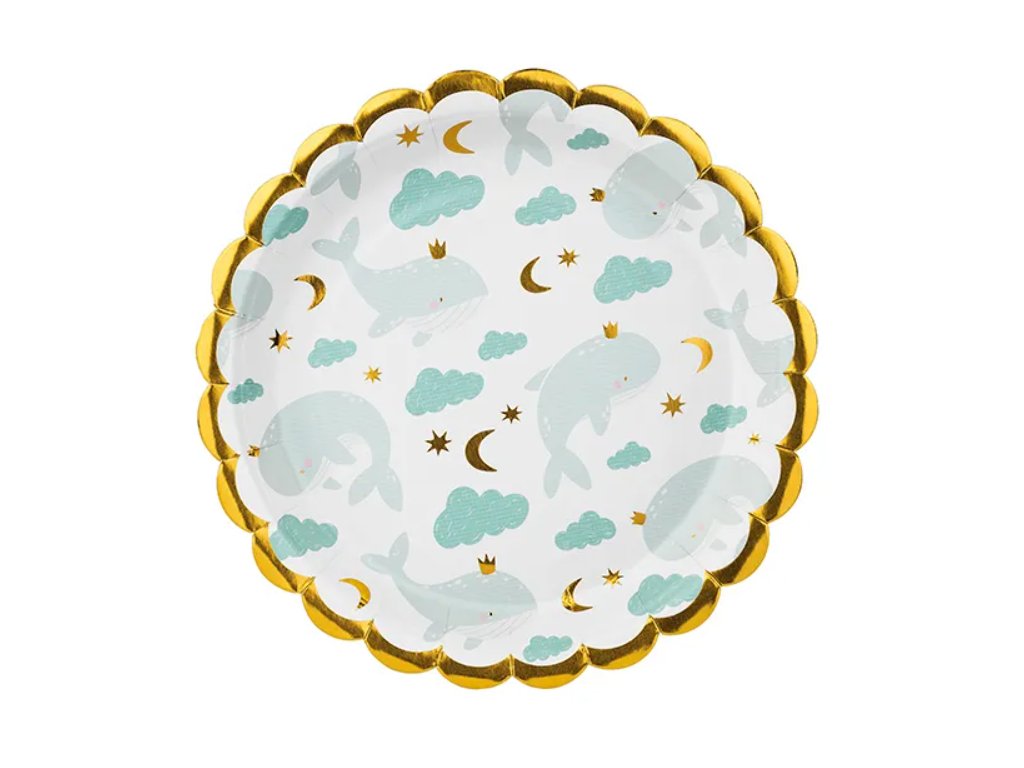 Rozkošné papírové talířky s motivem modré velryby s korunkou🐋👑 vykouzlí úsměv na každé dětské oslavě! Bílý podklad doplňuje zlatý vlnitý okraj, který dodává celé kolekci nádech kouzelné elegance ✨💙.