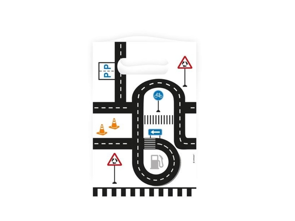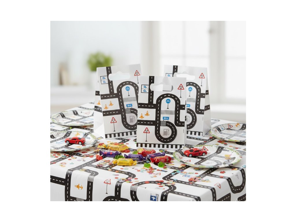 Veselé papírové tašky Silnice doprava s motivem silnic a dopravních prvků jsou ideální pro zabalení sladkostí, drobných dárečků nebo překvapení pro kamarády.