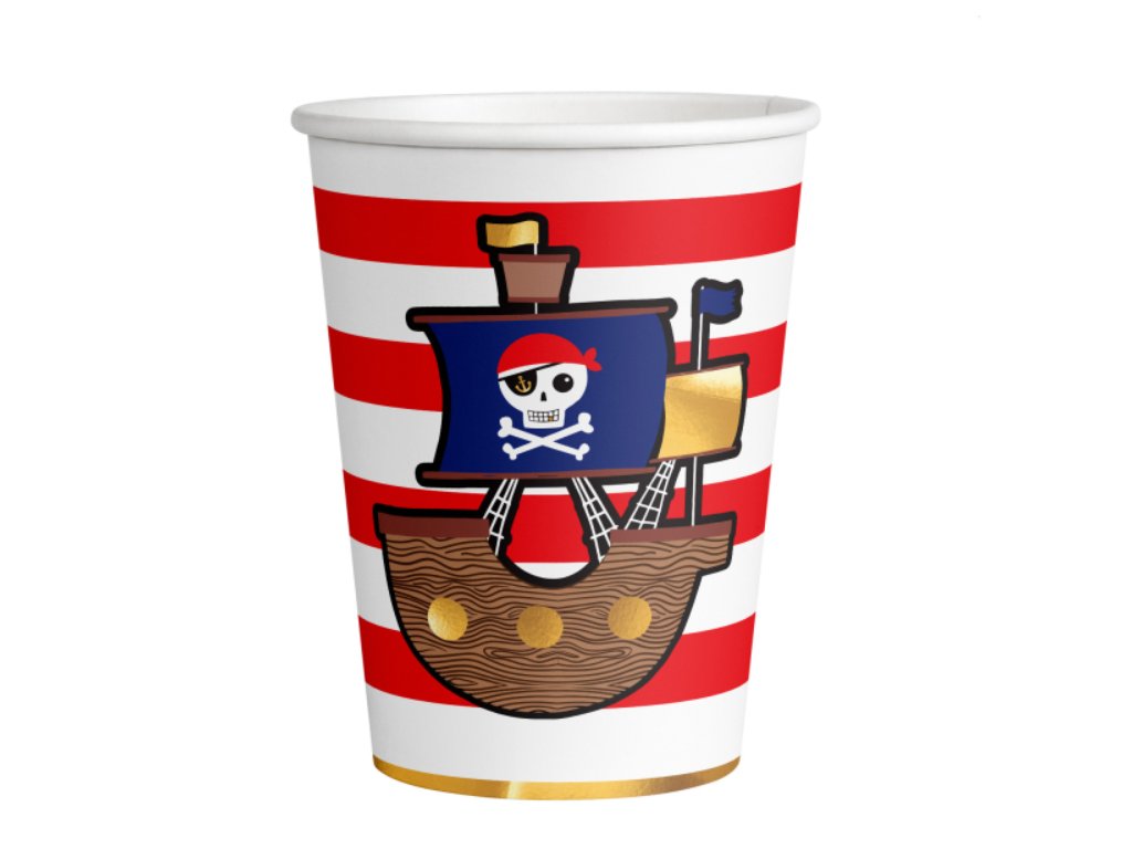 Stylové párty kelímky s červenými pruhy a obrázkem pirátské lodi skvěle doplní každou pirátskou narozeninovou oslavu. Potěší malé dobrodruhy a vytvoří tu pravou atmosféru na palubě.