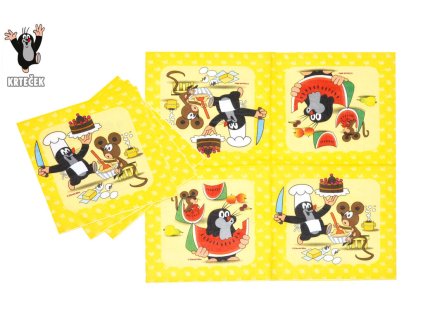 Párty ubrousky Krtek a kamarádi 12 ks, 16,5 x 16,5 cm. Žluté ubrousky se dvěma různými obrázkovými motivy oblíbeného Krtečka a jeho kamarádů.