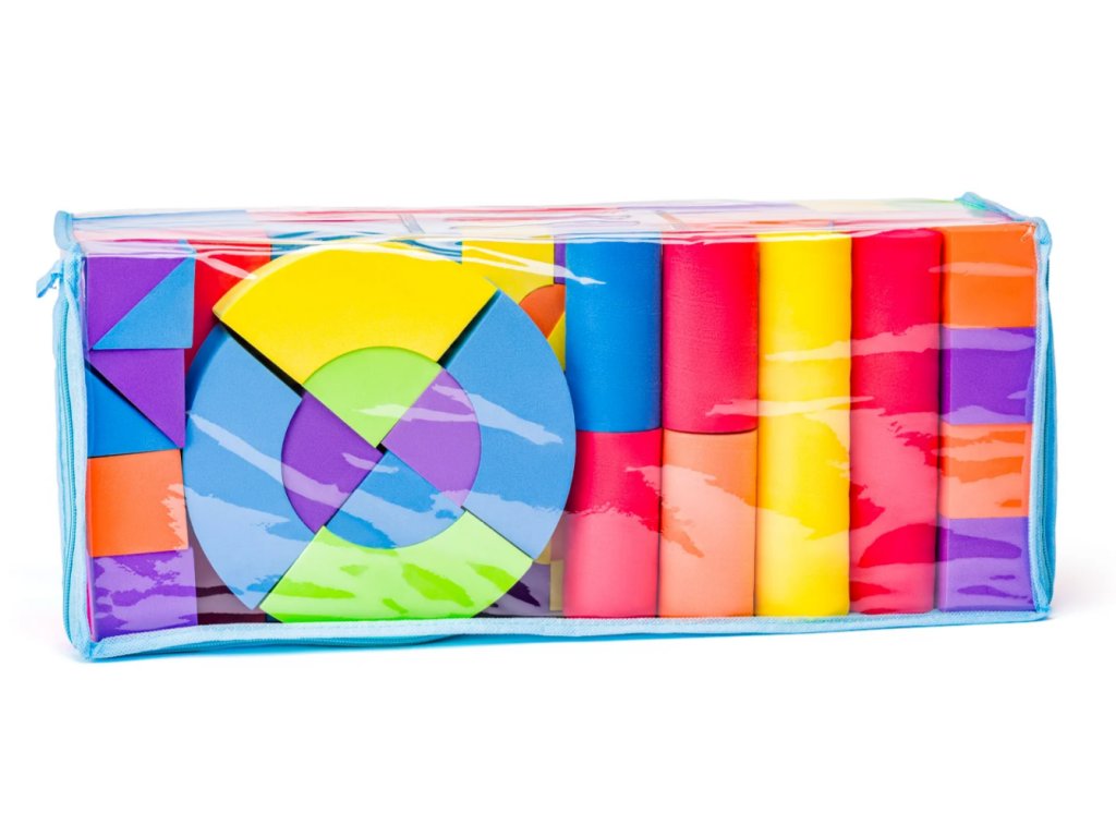 Tato sada obsahuje 52 barevných kostek různých tvarů – válce, kvádry, kostky i půlkruhy – ideální pro snadné a bezpečné stavění. Kostky jsou vyrobené z měkkého pěnového materiálu, který je lehký, příjemný na dotek a zcela bezpečný. Nemají ostré hrany, takže si děti při hraní ani pádu neublíží.