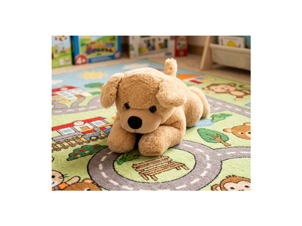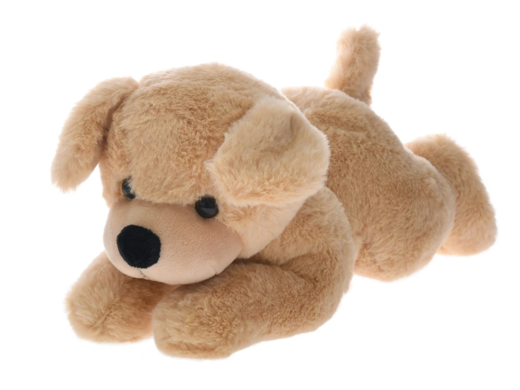 Pejsek má realisticky zpracované detaily a skleněné oči, které mu dodávají živý a přátelský výraz. Jeho ležící poloha působí přirozeně a umožňuje snadné hraní i přenášení, takže si ho děti mohou vzít kamkoliv s sebou – do postele, na cesty nebo k odpočinku u pohádek.