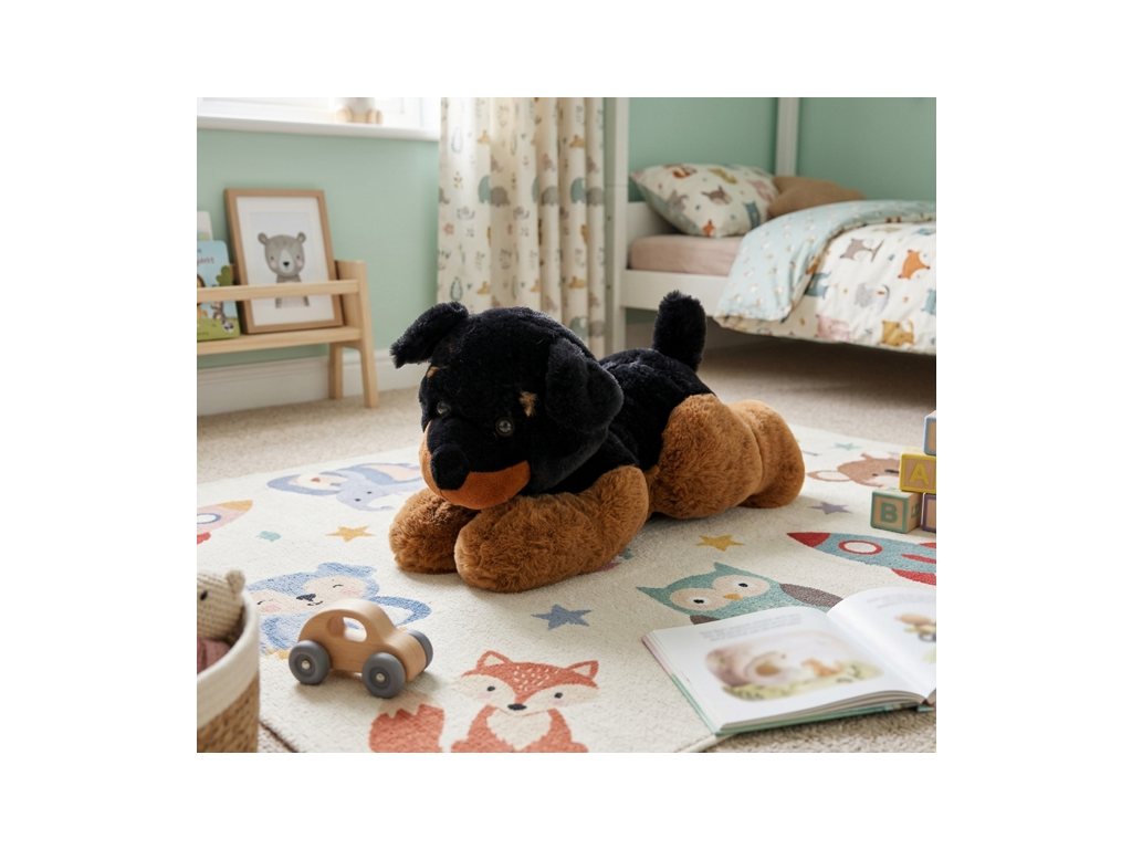 Pejsek má realisticky zpracované detaily a skleněné oči, které mu dodávají živý a přátelský výraz. Jeho ležící poloha působí přirozeně a umožňuje snadné hraní i přenášení, takže si ho děti mohou vzít kamkoliv s sebou – do postele, na cesty nebo k odpočinku u pohádek.