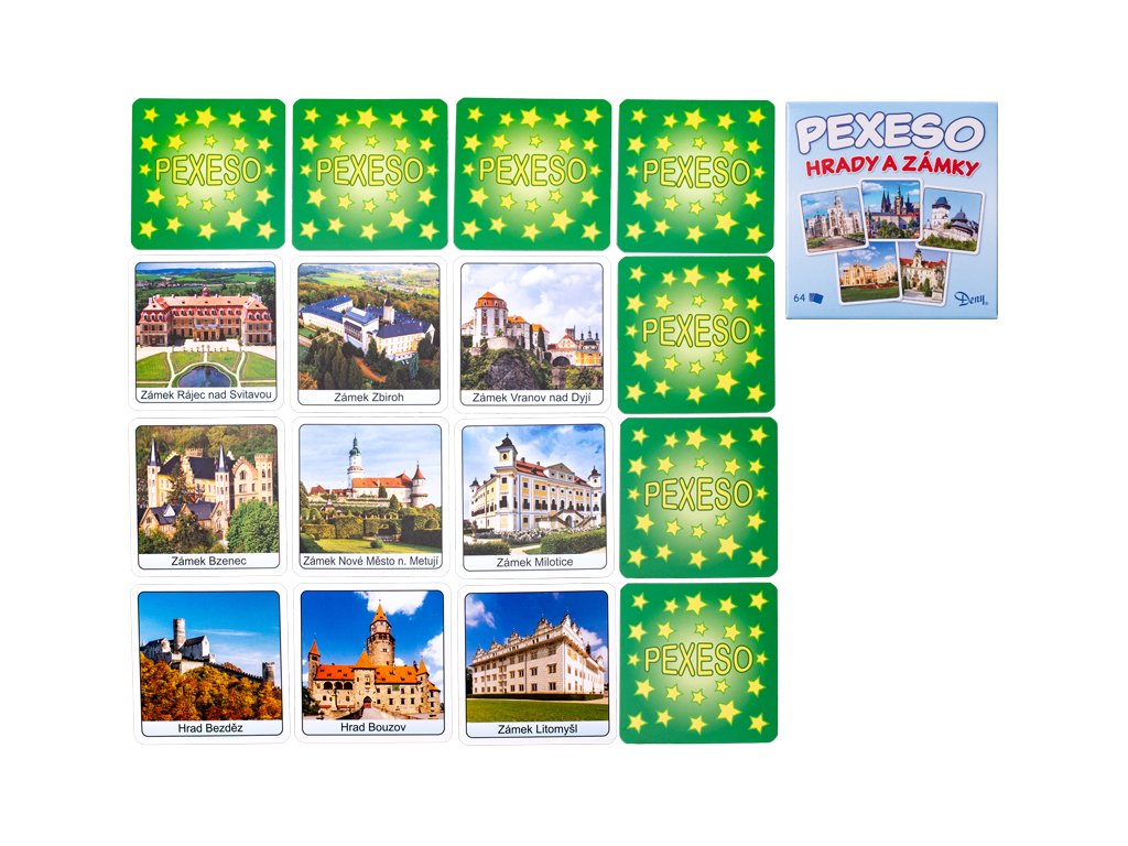 Poznávej krásy Česka hravě! Zábavné pexeso Hrady a zámky od firmy Mikro Trading – hračky s duchem přináší dětem i dospělým poutavou zábavu i poznávání českých památek. Na celkem 64 kartičkách najdete malebné obrázky známých hradů a zámků , které si zamilujete na první pohled. Díky praktické krabičce je pexeso ideální i na cesty. Hra trénuje paměť, soustředění a postřeh , a je tak skvělou volbou pro rodinné večery i školní aktivity. 🔑 Klíčová slova: pexeso hrady a zámky, pexeso pro děti, pexeso Mikro Trading, vzdělávací hra, paměťová hra, české památky, hračky s duchem, pexeso v krabičceDoplňkové parametry