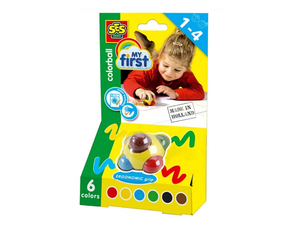 Moje první – barevná kulička na kreslení je skvělá kreativní pomůcka pro nejmenší děti 🎨✨ od SES creative. Tato originální kulička obsahuje šest barevných voskových hrotů, které umožňují i těm nejmenším bezpečně zkoumat barvy 🌈.