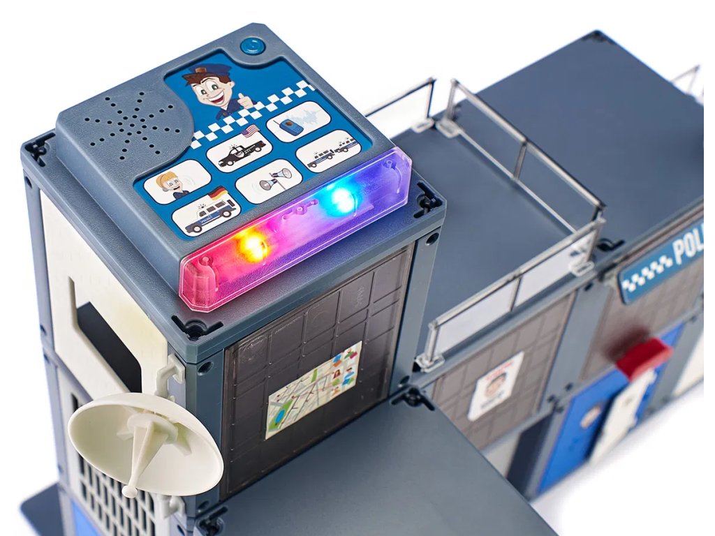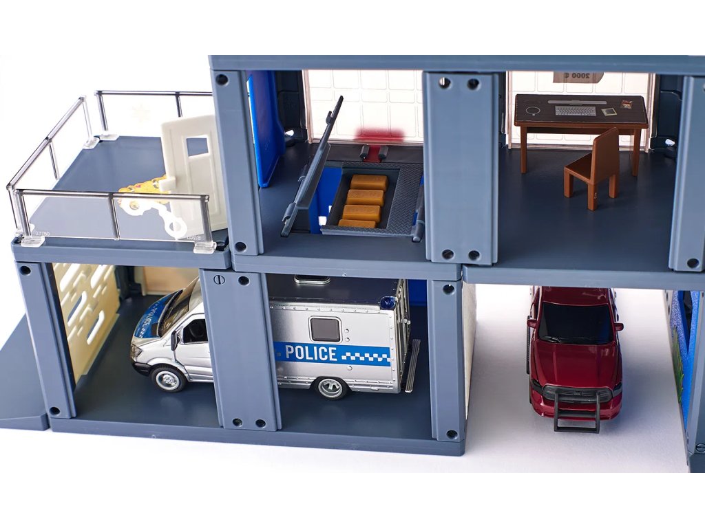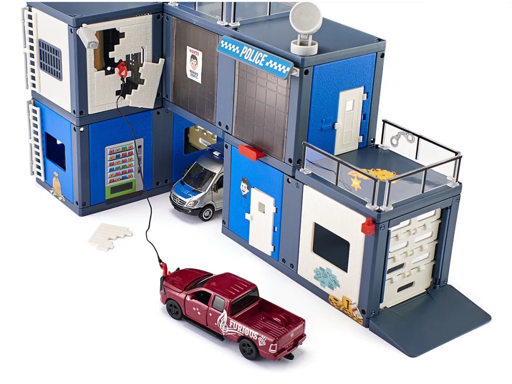SIKU World – policejní stanice. Dvoupodlažní budovu lze sestavit dle ilustrovaného návodu. Z montážních části mohou být jednotlivé budovy sestaveny ve tvaru L, U nebo jako vícepodlažní budovy. Nový systém stavebních prvků, modulární struktura a stabilita systému push-fit dává dětem prostor pro kreativitu a podporuje rozvoj motorické a kognitivní dovednosti dítěte. Dále posiluje sebevědomí a schopnost vytvářet bez pomoci dospělých. Policejní stanice je kompatibilní s ostatními sadami v SIKUWORLD, ale je plně funkční i samostatně. Sada obsahuje více než 110 dílů. Samolepky na budovu, doplňky, světelná a zvuková signalizace. Stěna s díly puzzle systému se rozbije při úniku zadrženého.Doplňkové parametry