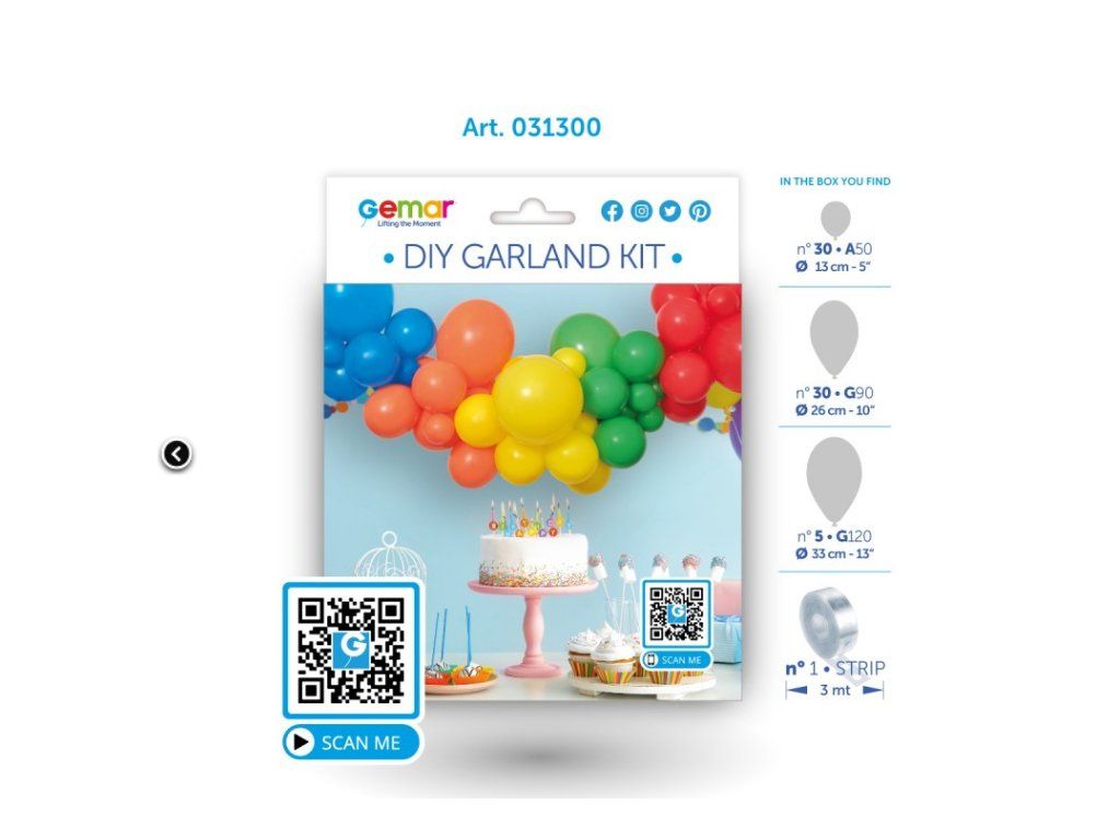 Balení obsahuje vše potřebné – malé, střední i velké balónky a 3metrový pásek, díky kterému girlandu snadno sestavíte.