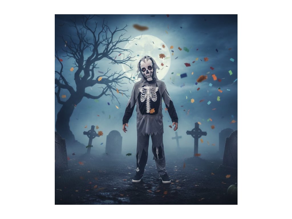 Strašidelný dětský kostým Kostlivec dostupný ve velikostech S, M. Ideální pro Halloween, karneval, maškarní ples nebo tematické oslavy. Pohodlný materiál a snadné nošení.