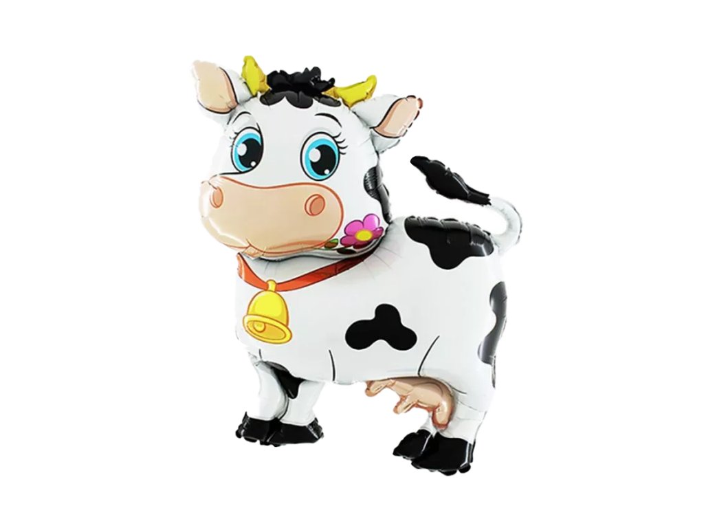 Klíčová slova: fóliový balónek, kravička, 90 cm, dětská oslava, tematická párty, dekorace, heliový balónek, dárek, zvířecí motiv, farmářská párty.