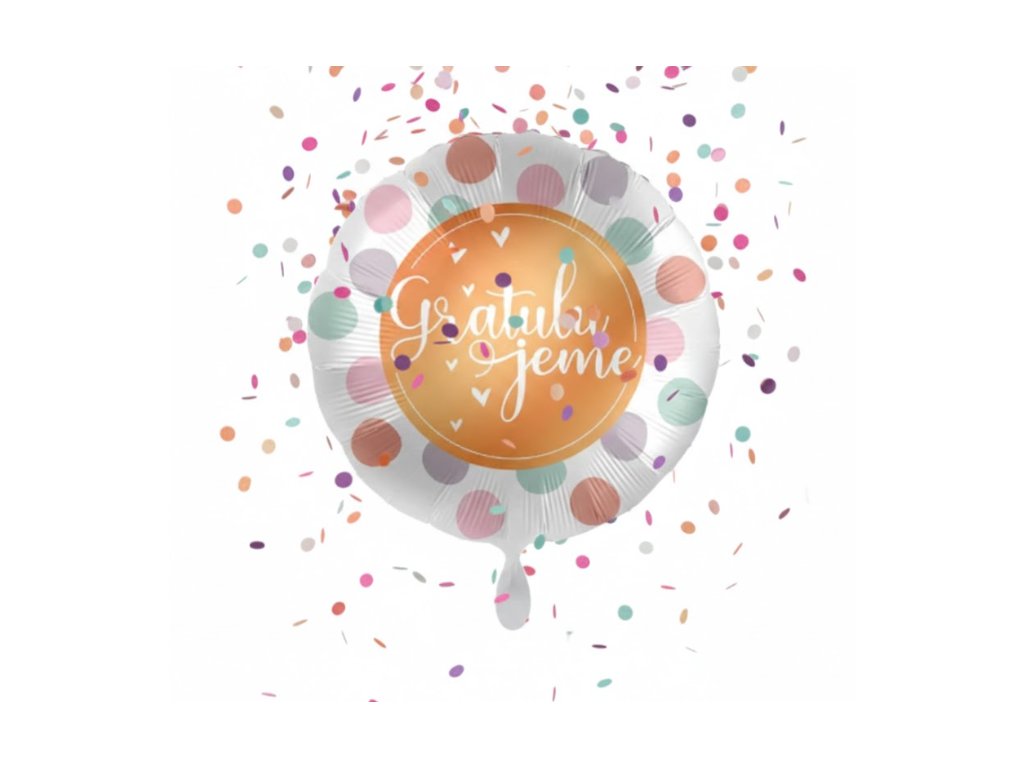 Oslávte krásne okamihy štýlovo s fóliovým balónikom Gratulujeme v bielej farbe s veselými farebnými bodkami 🎉🎈 Tento univerzálny balónik je ideálny na narodeniny, promócie, úspechy, výročia aj iné slávnostné príležitosti.