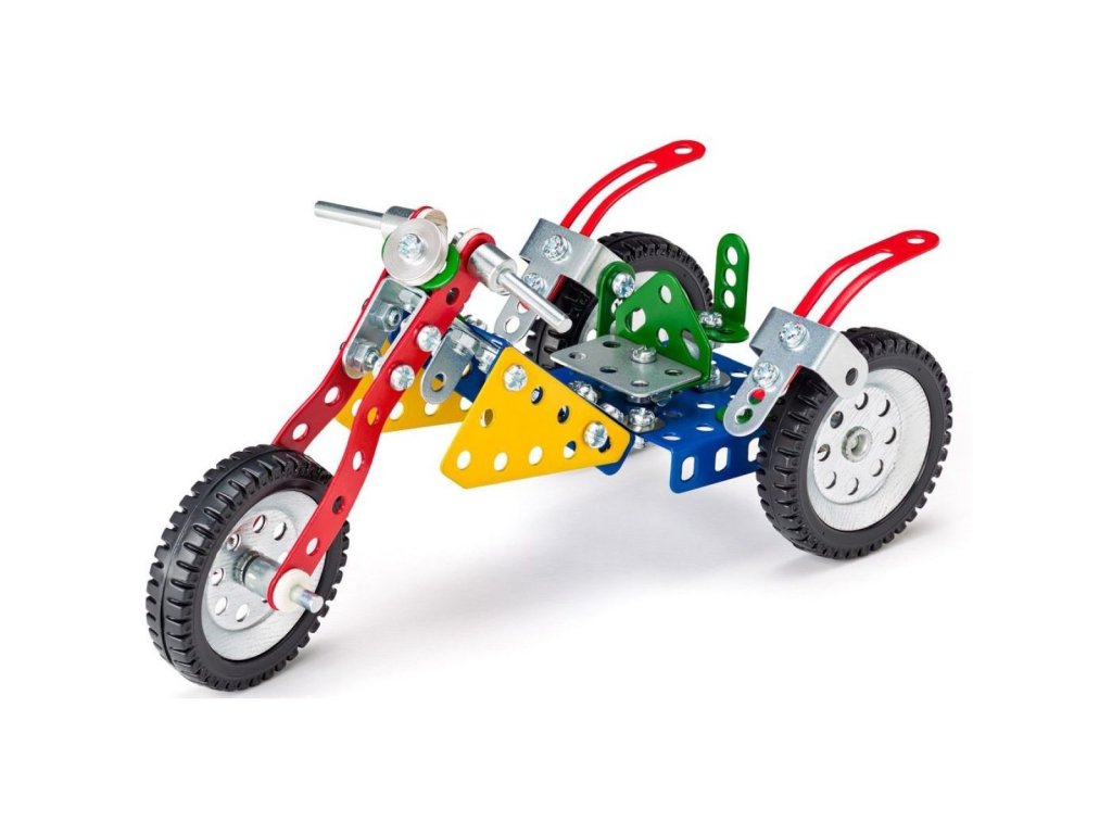 Tento set z legendární české kovové stavebnice ti umožní postavit až 10 různých modelů motorek – od klasických až po sportovní.
