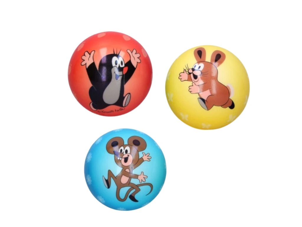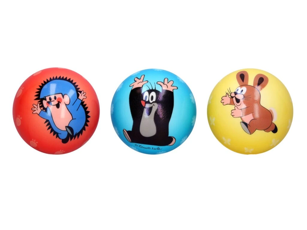 K dispozici jsou tři barevné varianty – modrá, žlutá a červená, přičemž na každém míčku najdete dva různé obrázky, ale vždy je tam krteček s oblíbenými postavičkami.