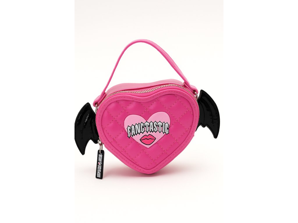 Tato mini kabelka má tvar růžového polstrovaného srdce s černými netopýřími křídly, perfektní pro Draculauru.