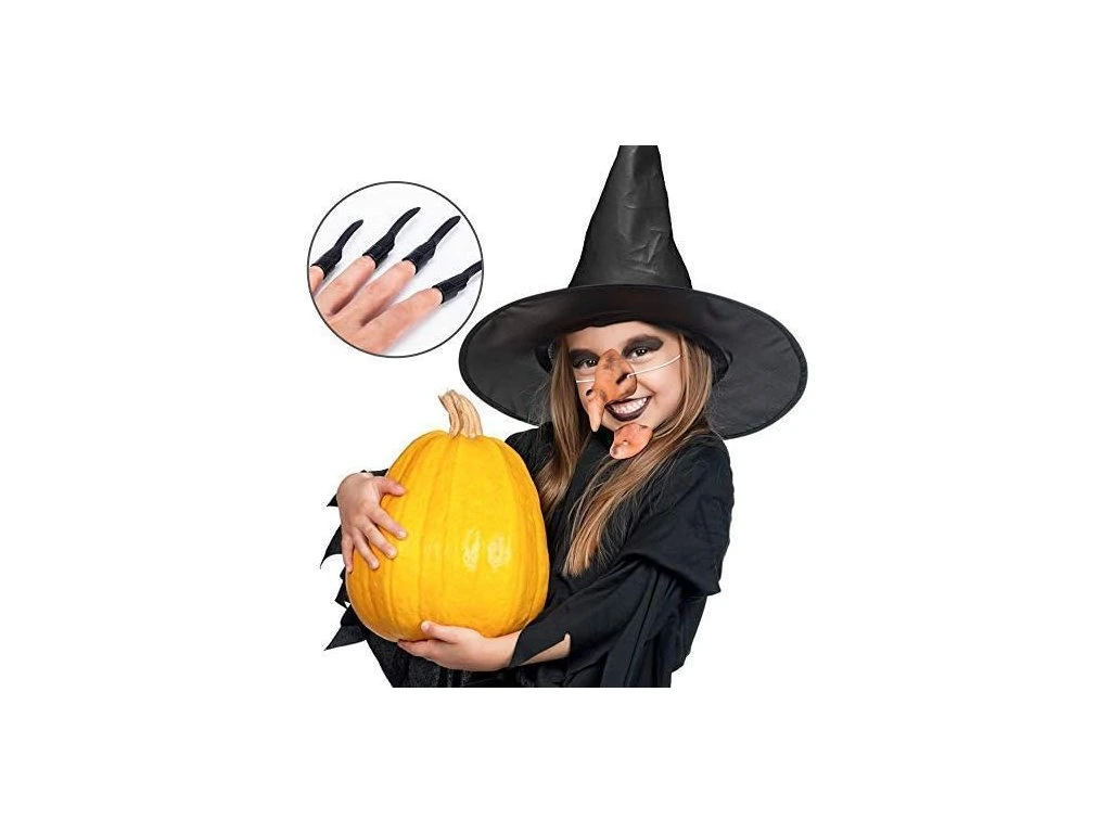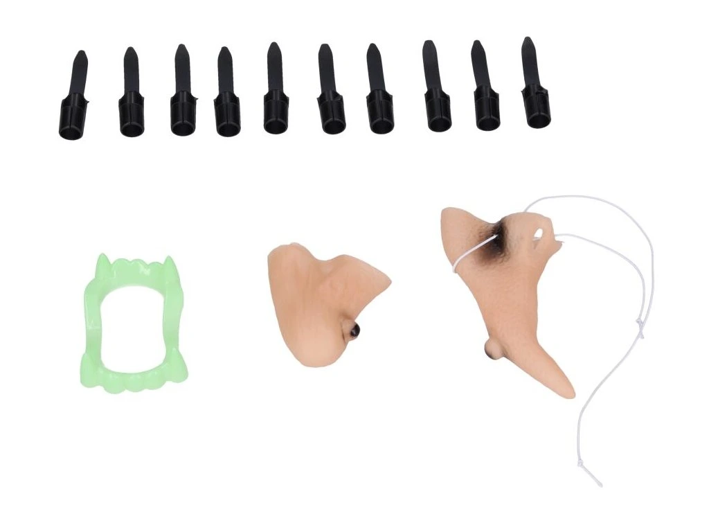 Součástí setu je brada a nos na gumičce, které přidají vašemu vzhledu ten pravý děsivý efekt. Deset nasazovacích prstů s dlouhými nehty promění vaše ruce v opravdové čarodějnické drápy. Nezapomínáme ani na zuby, které dotvoří hrůzostrašný úsměv. A samozřejmě nesmí chybět ikonický velký čarodějnický klobouk, který dokonale završuje tento strašidelný vzhled.
