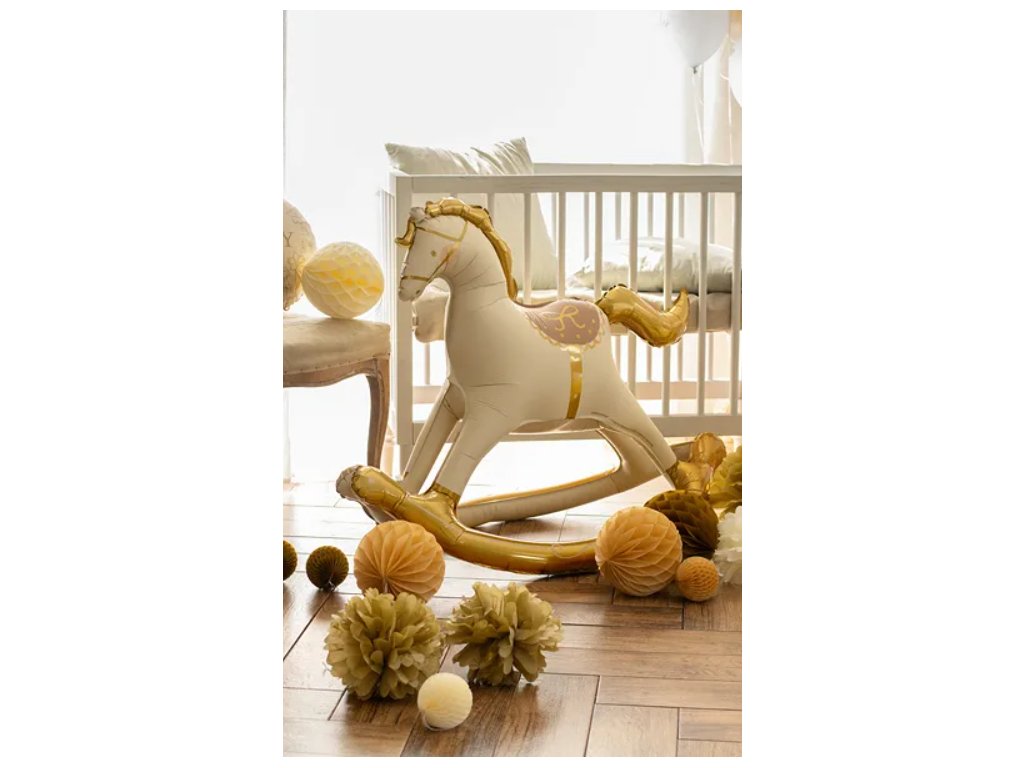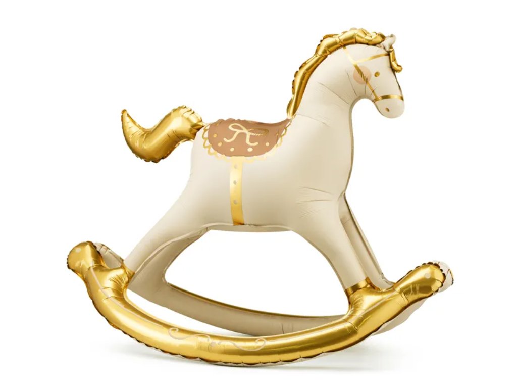 Kouzelný stojící fóliový balónek ve tvaru houpacího koníka okouzlí malé i velké! 🥰 Balónek je laděný do jemné béžové barvy se zlatými detaily – hřívou, ocasem, sedlem i houpacími lyžinami, které mu dodávají luxusní vzhled. 💛