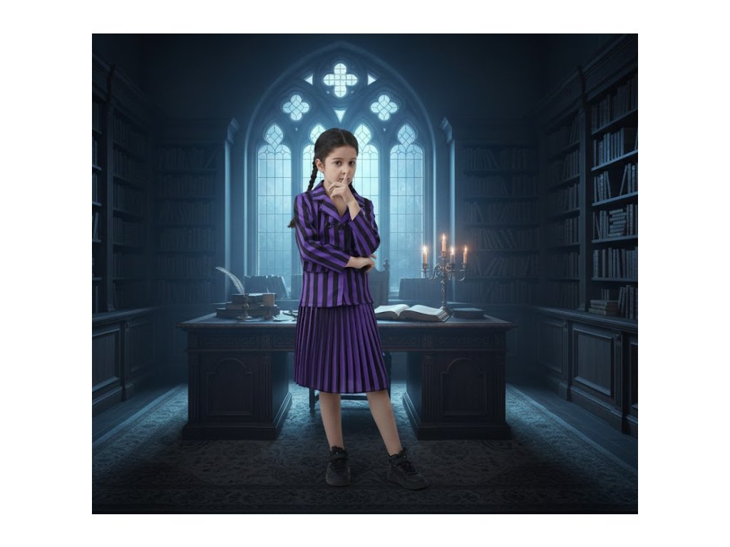Staňte se hvězdou každé oslavy s kostýmem Wednesday Addams – fialová uniforma, který spojuje eleganci, tajemno a originální styl! 🌟
